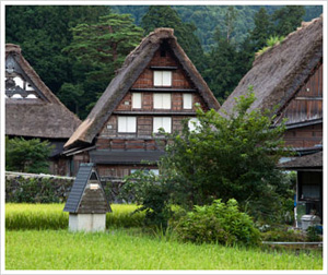 世界遺産の合掌造りの家屋群は400年前のものもあり、奥飛騨の美しい原風景が広がる。